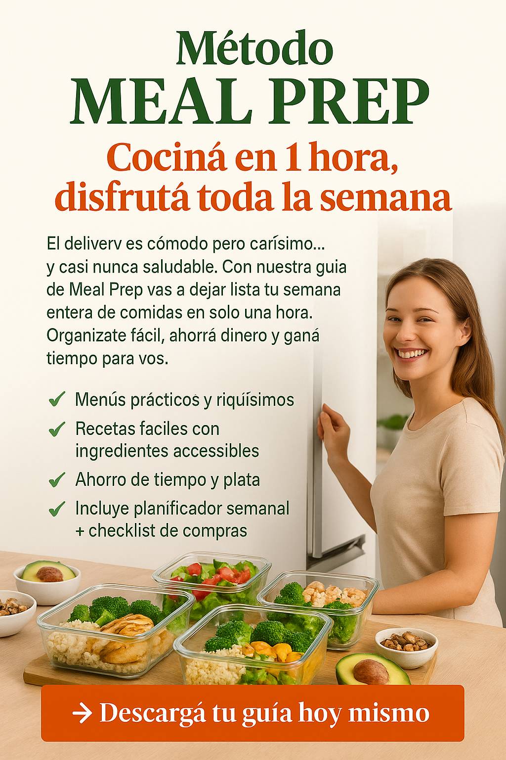 Con esta guía digital vas a descubrir cómo dejar listas tus comidas para toda la semana en solo una hora, comiendo rico y sin complicarte.